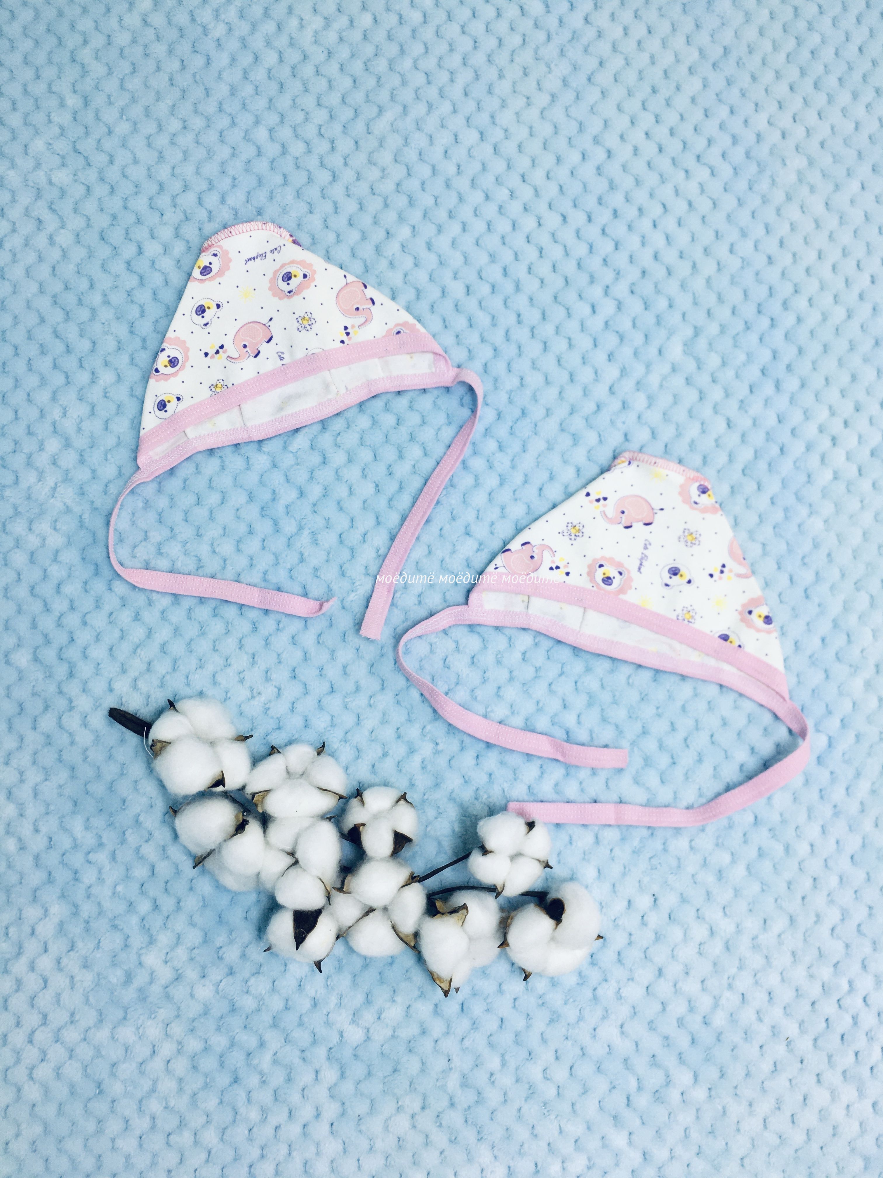 Чепчик выполнен из 100% хлопка (интерлок).