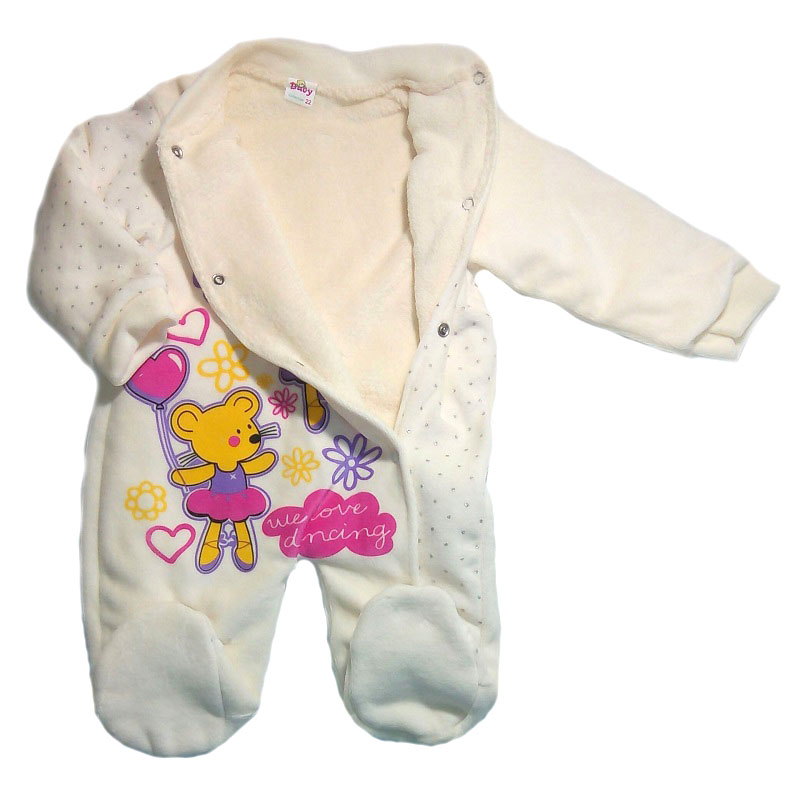 Комбинезон без капюшона, с закрытыми ножками, рукава на манжете, спереди на кнопочках от воротничка до конца ножки. Украшен спереди рисунком персонажей из мультиков.